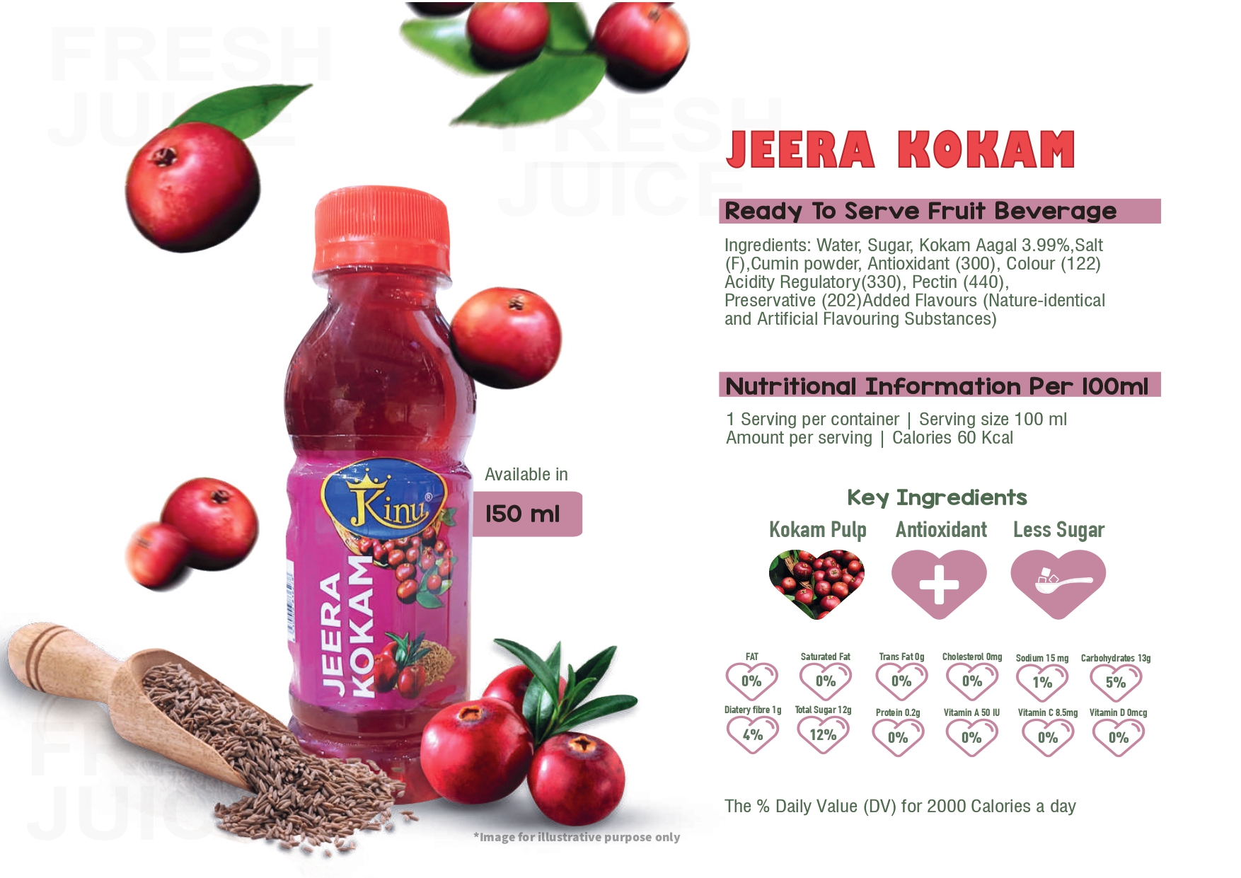 Buy Kinu Jeera Kokam Juice – a tangy, spicy Indian drink made with kokum and cumin. Digestive, refreshing, and completely natural.